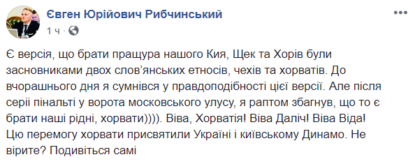 Депутат Евгений Рыбчинский после матча понял, что мифологический украинец Хорив был основателем хорватского этноса: