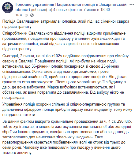 В Закарпатской области мужчина поссорился с женщиной, угрожая ей гранатой. Об этом сообщает пресс-служба ГУ НП в Закарпатской области.