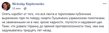 "Опять коробит от того, что вся лента в торопливом публичном выражении горя по поводу смерти Лукьяненко украинскими политиками, не замеченными ни в чем, кроме жадности, глупости и надувания щек. Теми, что довели Украину до прямой противоположности тому, чем она задумывалась тридцать лет назад", – написал он.