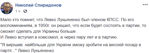 "Я вирішив: найбільше для України зможу зробити на високій посаді в партії..." Левко Лукьяненко", - напоминает политолог Николай Спиридонов.