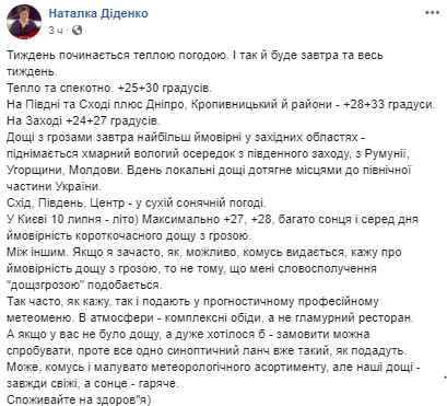 При этом синоптик Наталья Диденко не исключает возможность кратковременного грозового дождя.