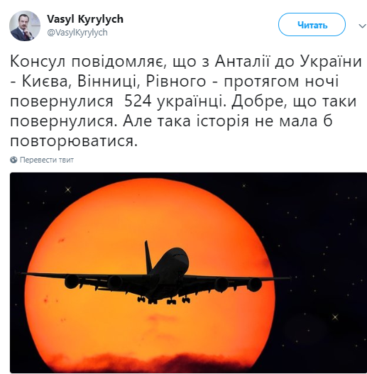 Минувшей ночью 12 июля из турецкой Анталии в Украину (а конкретно в Киев, Винницу и Ровно) удалось вернуть 524 украинца.