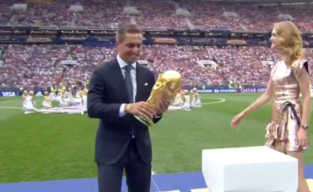 17:50 Наталья Водянова и легендарный защитник, чемпион мира-2014 Филипп Лам открыли створки защитного чемоданчика кубка мира. Немецкий футболист снова поднял его и выносит на специальную стойку на поле.