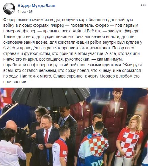 "Фюрер вышел сухим из воды, получив карт-бланш на дальнейшую войну в любых формах. Фюрер — победитель, фюрер — под первым номером, фюрер — превыше всех. Хайль! Всё это — заслуга фюрера. Только для него, для укрепления его бесчеловечной власти, для её очеловечивания вовне, для кристаллизации рейха внутри был куплен у ФИФА и проведён в стране-террористе этот чемпионат. Позор всем странам и футболистам, кто принял в этом участие. А все, кто так или иначе его пиарил, восхищался, рукоплескал, — как минимум, поработали на фюрера и русский рейх полезными идиотами. Жму руки всем, кто остался цельным, кто сразу понял, что к чему, и не сломался по ходу. Нас таких много. Слава Украине, к черту Мордор в любом его проявлении", - написал Муждабаев.