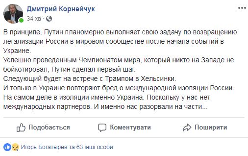 Политолог Дмитрий Корнейчук пишет, что Путин "планомерно выполняет свою задачу по возвращению легализации России в мировом сообществе после начала событий в Украине": "Следующий шаг будет на встрече с Трампом в Хельсинки. И только в Украине повторяют бред о международной изоляции России. На самом деле в изоляции именно Украина. Поскольку у нас нет международных партнеров. И именно нас разорвали на части..."