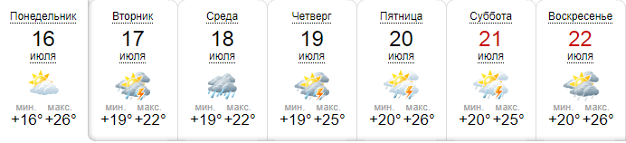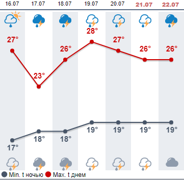 Сайт сайта Sinoptik.ua, считает, что без осадков на этой неделе будет только в понедельник, 16 июля. А со вторника и по воскресенье пригодятся зонты. Дневная температура +22...+26.