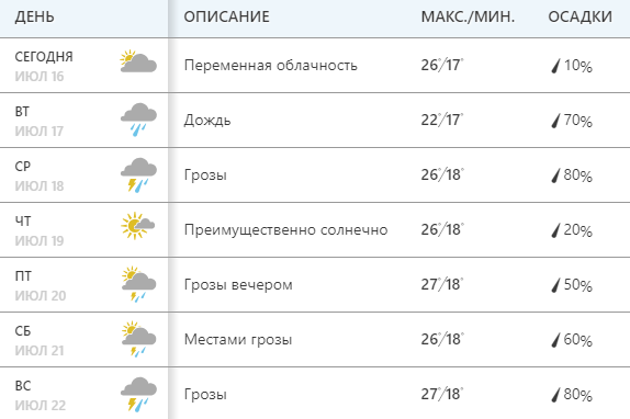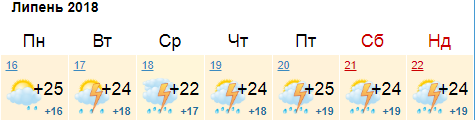 Ресурс Мeteoprog.ua также обещает, что с 16 по 22 июля в Киеве ожидаются дожди с грозами. Столбики термометров покажут от +23 до +28 днем.