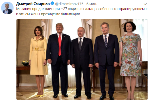 Первая леди США Мелания Трамп, которая прибыла вместе с супругом на саммит в Хельсинки, удивила публику выбором нарядом, которые были неуместными для жаркой погоды.