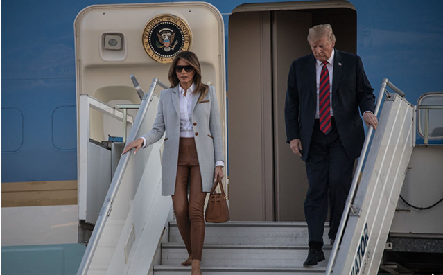 Интересно, что из самолета первая леди вышла в кожаных брюках и осеннем пальто. Возможно, что она так она подготовилась к визиту в северную страну.