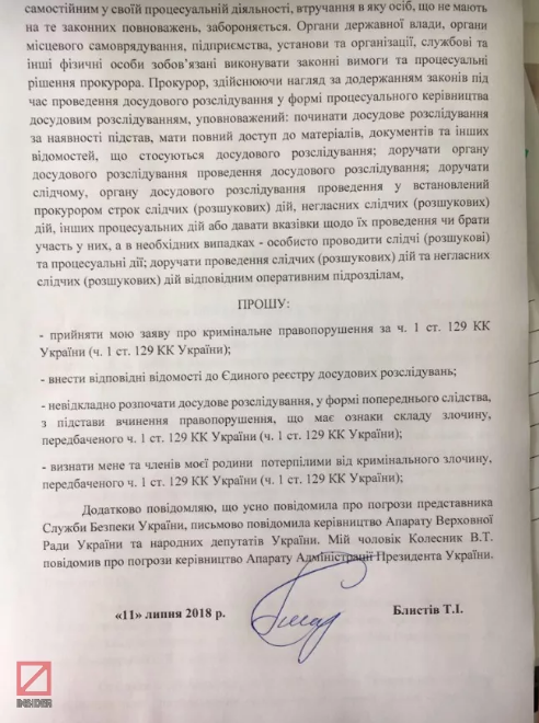Волкова также опубликовала документ, в котором Блистив излагает суть проблемы одному из руководителей аппарата Верховной Рады.