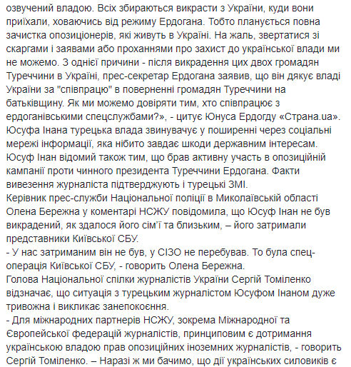 Напомним, происшествие случилось 15 июля в Николаеве. Сотрудники СБУ задержали известного у себя на родине оппозиционного журналиста и блогера Юсуфа Инана у него дома. Далее сотрудники Национальной разведывательной организации Турции (МИТ) доставили журналиста из Украины в Турцию.