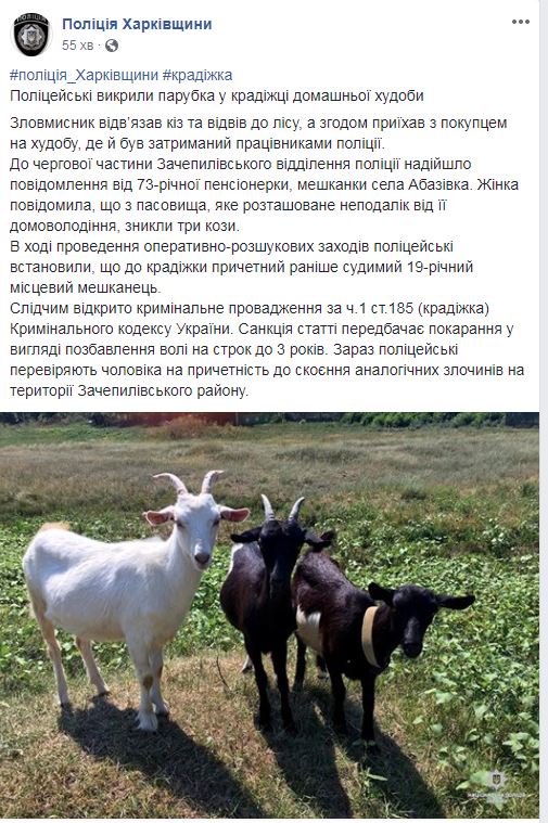 73-летняя женщина, жительница села Абазовка, сообщила полиции Зачепиловского отделения, что на пастбище, расположенном неподалеку от ее дома, исчезли три козы.