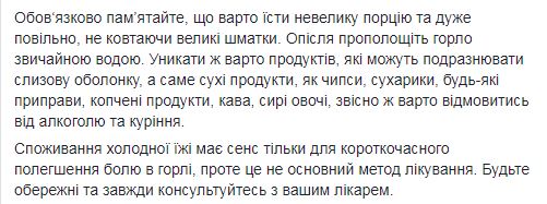 "Это ни в коем случае не может быть лечением, однако хороший метод временного обезболивания. Холодное стимулирует сужение сосудов и миндалин, поэтому консервирует воспалительные процессы в горле. Кроме того, когда есть отек в горле, очень трудно есть обычные продукты. Небольшая порция мороженого помогает уменьшить боль и облегчает процесс глотания пищи", - пишет министр здравоохранения.