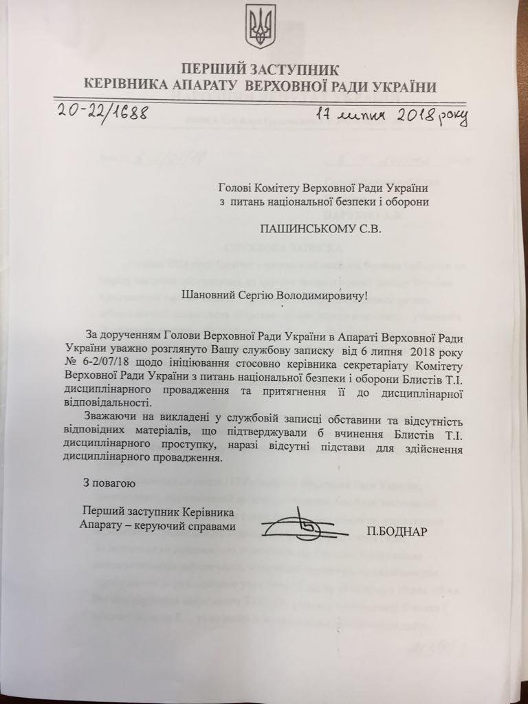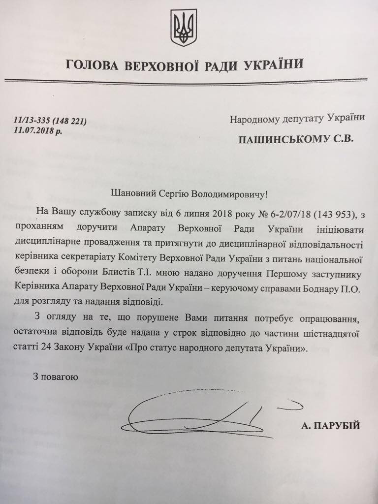 Что самое интересное, в аппарате Рады никаких нарушений со стороны Блистив по итогу не нашли. Об этом говорится в ответе на запрос Пашинского.