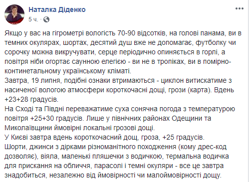 "В Киеве завтра днем ​​кратковременный дождь, гроза, +25 градусов. Шорты, джинсы с дырками различного происхождения (кому дресс-код позволяет), веера, маленькие бутылочки с водичкой, термальная водичка для прысканья на лицо, зонты и темные очки - все это завтра понадобится, независимо от вероятности или маловероятности дождя," - отметила синоптик.