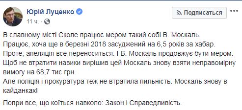 "Чтобы не потерять навыки, решил этот Москаль снова взять неправомерную выгоду на 68,7 тысячи гривен. Но полиция и прокуратура тоже не потеряла бдительность. Москаль снова в наручниках!" - написал Луценко.