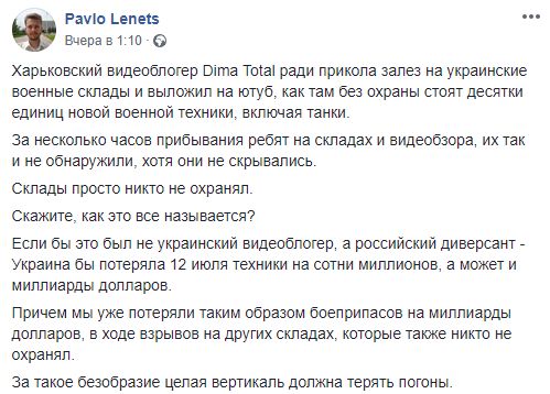 Блогер Павел Ленец также возмущается: "Харьковский видеоблогер Dima Total ради прикола залез на украинские военные склады и выложил на ютуб, как там без охраны стоят десятки единиц новой военной техники, включая танки.