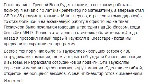 "Что будет дальше? Я спокоен за "Киевстар": еще будет много интересных проектов запущено и объявлено в 2018 году и, особенно, в 2019 - но о них теперь пусть говорит новый СЕО. Я передаю ему растущую компанию в очень хорошем состоянии, и уверен, что "Киевстар" продолжит уверенное движение вперед к новым рекордам, по заветам Джима Коллинза в книге "От хорошего к великому", как это было и с "Карлсберг Украина" после нашего расставания", - подчеркнул Чернышов.