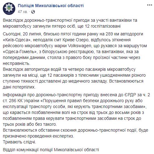 В пятницу, 20 июля, около 5:00 на трассе "Киев-Одесса" неподалеку от пгт Кривое Озеро произошло ДТП. Погибли пятеро человек, еще 12 госпитализированы. Об этом сообщает отдел коммуникации полиции Николаевской области на своей странице в Facebook.