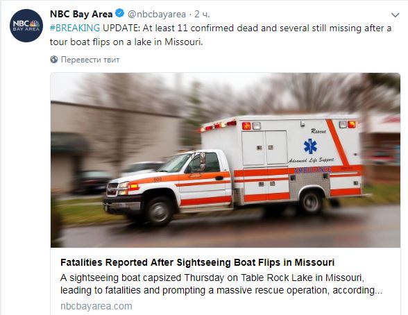 В американском штате Миссури из-за опрокидывания прогулочной лодки на озере Тейбл Рок погибли 11 человек. Об этом в Twitter сообщает телеканал NBC со ссылкой на местные власти.