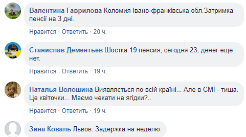 В комментариях пользователи массово жалуются на задержку пенсий в Полтаве и Киеве.