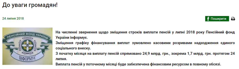 "На многочисленные обращения по смещению сроков выплаты пенсий в июле 2018 Пенсионный фонд Украины информирует. Смещение графика финансирования выплат обусловлено кассовыми разрывами поступления единого социального взноса", - говорится на сайте ПФУ.