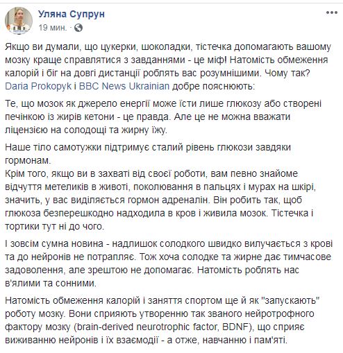"Если вы думали, что конфеты, шоколадки, пирожные помогают вашему мозгу лучше справляться с задачами - это миф! Зато ограничение калорий и бег на длинные дистанции делают вас умнее", - пишет она.