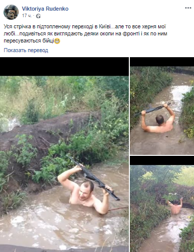 "Посмотрите, как выглядят некоторое окопы на фронте и как по ним передвигаются бойцы", - написала в соцсети Виктория Руденко, которая заметила, что последствия непогоды в зоне боевых действий не идут ни в какое сравнение с вызвавшим ажиотаж затоплением дождями Киева.