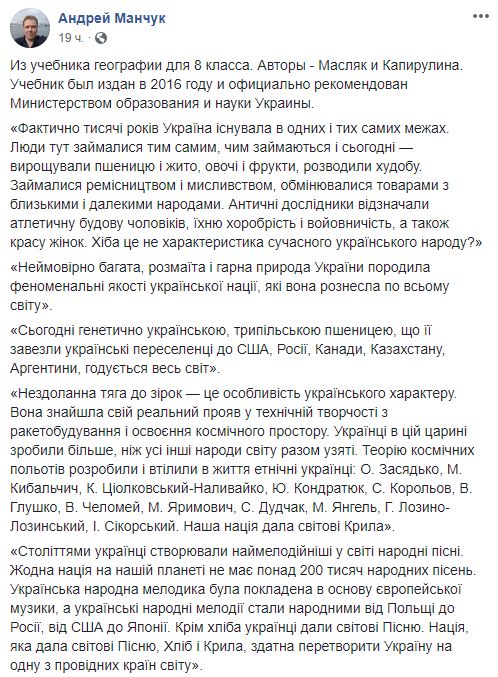 Учебник географии для украинских школьников удивил пользователей социальных сетей тем, что некоторых местах украинская нация превозносится как лучшая в мире. Учебник предназначен для 8 класса и официально рекомендован Министерством образования и науки Украины. Авторы - Масляк и Капирулина. Учебник был издан в 2016 году. Самые яркие цитаты привел в своем Facebook журналист Андрей Манчук.