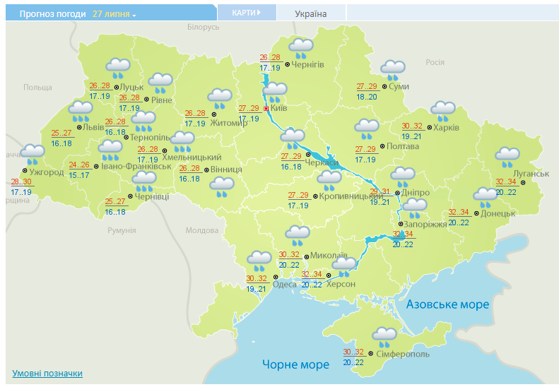 В течение пятницы, 27 июля, в Украине ожидается теплая, но облачная погода с прояснениями. Об этом говорится в сообщении Гидрометцентра.