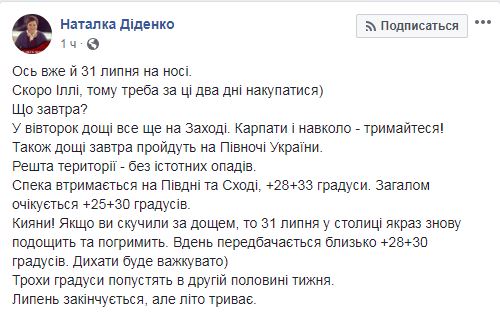 "Скоро Илья (Ильин день - Прим. Ред.), поэтому нужно за эти два дня накупаться. Что завтра? Во вторник дожди все еще на Западе. Карпаты и вокруг - держитесь! Также завтра дожди пройдут на севере Украины. Остальные территории - без существенных осадков", - пишет она.