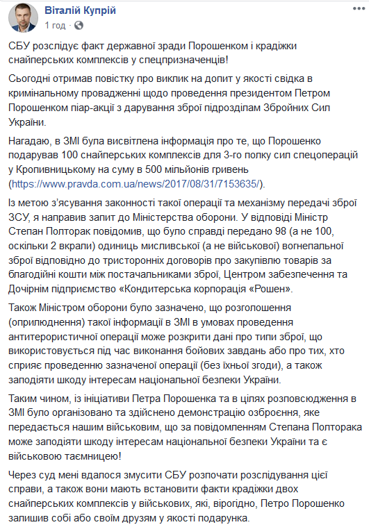 Через суд мне удалось заставить СБУ начать расследование этого дела, а также они должны установить факты кражи двух снайперских комплексов у военных, которые, вероятно, Петр Порошенко оставил себе или своим друзьям в качестве подарка", - написал Виталий Куприй.