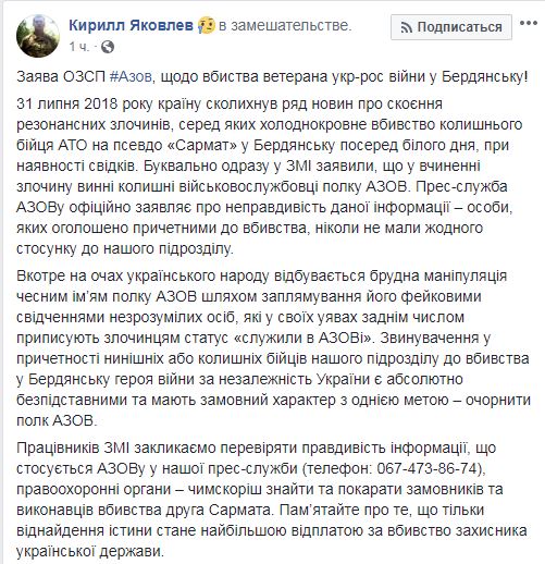 "Обвинения в причастности нынешних или бывших бойцов нашего подразделения к убийству в Бердянске героя войны за независимость Украины являются абсолютно безосновательными и имеют заказной характер с одной целью – очернить полк "Азов", - пишет пресс-служба.