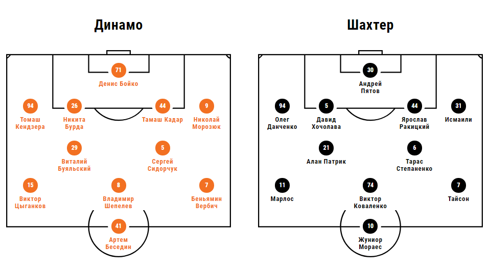 Шахтер: Пятов - защита Данченко, Хочолава, Ракицкий, Исмаили - полузащита - Степаненко, Патрик, Марлос, Коваленко, Тайсон - нападение Мораес.