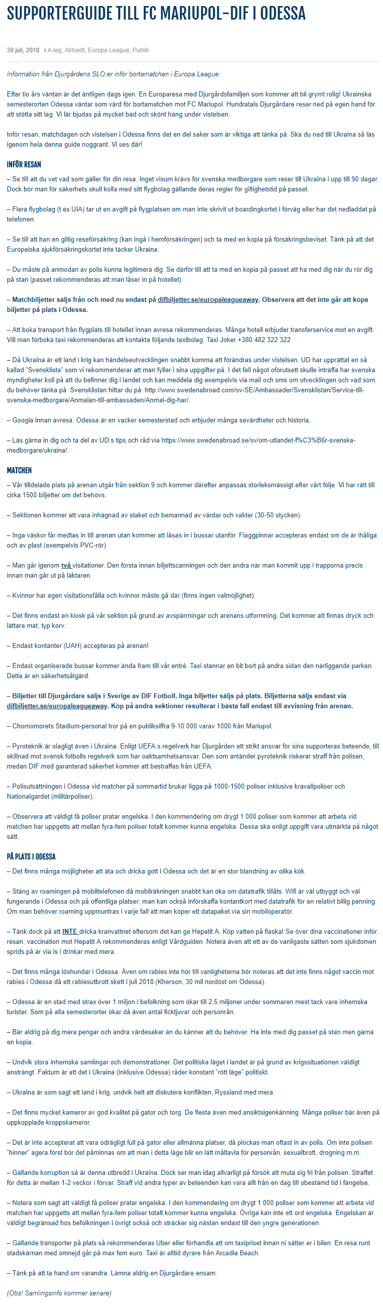 2 августа ФК "Мариуполь" в ответном матче 2-го раунда квалификации Лиги Европы выиграл в Одессе у шведского "Юргорден". Шведскую команду в Одессе поддержали около 1700 фанатов.