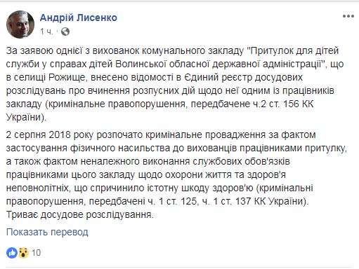Согласно ему, по заявлению одной из воспитанниц коммунального учреждения "Приют" службы по делам детей Волынской областной государственной администрации" в Рожище открыто уголовное производство по ч. 2 ст. 156 (развращение несовершеннолетних) Уголовного кодекса.