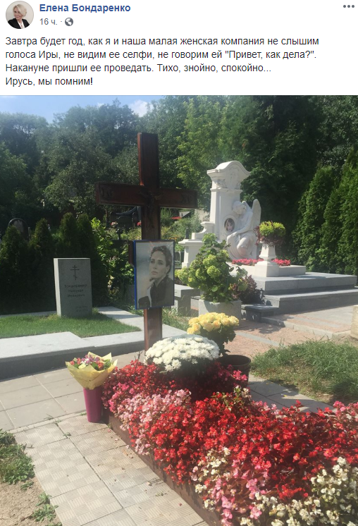 "Завтра будет год, как я и наша малая женская компания не слышим голоса Иры, не видим ее селфи, не говорим ей "Привет, как дела?". Накануне пришли ее проведать. Тихо, знойно, спокойно... Ирусь, мы помним!", - написала Бондаренко в Facebook.