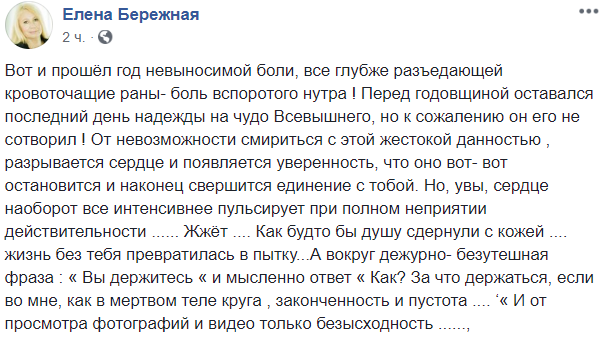 "Вот и прошёл год невыносимой боли, все глубже разъедающей кровоточащие раны- боль вспоротого нутра ! Перед годовщиной оставался последний день надежды на чудо Всевышнего, но к сожалению он его не сотворил ! От невозможности смириться с этой жестокой данностью , разрывается сердце и появляется уверенность, что оно вот- вот остановится и наконец свершится единение с тобой. Но, увы, сердце наоборот все интенсивнее пульсирует при полном неприятии действительности ...... Жжёт .... Как будто бы душу сдернули с кожей .... жизнь без тебя превратилась в пытку...А вокруг дежурно- безутешная фраза : "Вы держитесь "и мысленно ответ "Как? За что держаться, если во мне, как в мертвом теле круга , законченность и пустота .... ‘"И от просмотра фотографий и видео только безысходность ......,"