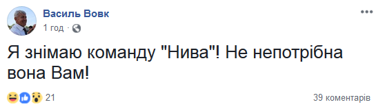 "Я снимаю команду Нива. Не ненужная она вам", - написал Вовк. Причем в такой трактовке, выражение приобретает смысл, что команда как раз и нужна болельщикам.