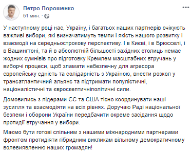 "В следующем году нас, Украину, и многих наших партнеров ожидают важные выборы, которые будут определять темпы и качество нашего развития и взаимодействия на среднесрочную перспективу. И в Киеве, и в Брюсселе, и в Вашингтоне, и в абсолютном большинстве западных столиц нет никаких сомнений о подготовке Кремлем масштабных вмешательств в избирательные процессы, чтобы сломать опасное для агрессора европейское единство и солидарность с Украиной, внести раскол в трансатлантический альянс и поддержать популистские, националистические и евроскептические политические силы. Договорились с лидерами ЕС и США тесно координировать наши усилия и взаимодействовать на всех уровнях. Поручаю Совету национальной безопасности и обороны Украины предусмотреть отдельное заседание по противодействию вмешательству в выборы", - говорится на странице президента.