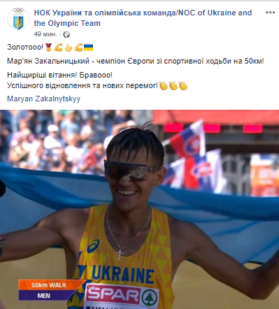 Украинский спортсмен Марьян Закальницкий стал чемпионом Европы в спортивной ходьбе на 50 километров. Об этом в соцсети сообщает Национальный олимпиский комитет Украины.