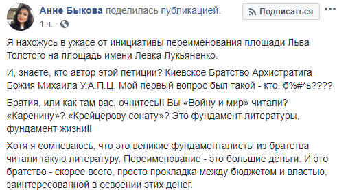 А также интересуются, чем Толстой насолил киевлянам и что эпопея с переименованием площади уже выходит за рамки приличия.