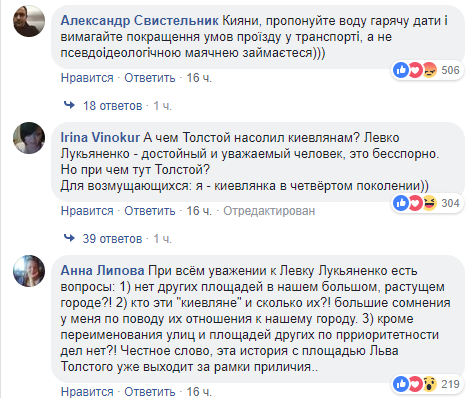 В соцсети многие киевляне негативно отнеслись к инициативе переименования. До 1939 года площадь носила название Караваевская. Таким образом, современное название в честь русского писателя она носит 79 лет.