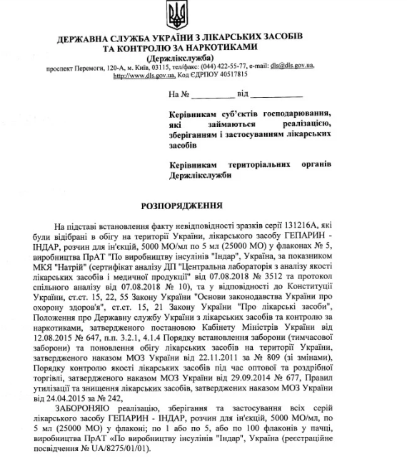 Также на территории Украины запрещено реализовывать, применять и хранить раствор для инъекций "Гепарин-Индар" Серия АВ 178-1/1, 5000 МЕ/мл, по 5 мл (25000 МЕ) во флаконе; по 1 или по 5, или по 100 флаконов в пачке, ООО "Юрия-Фарм", Украина.