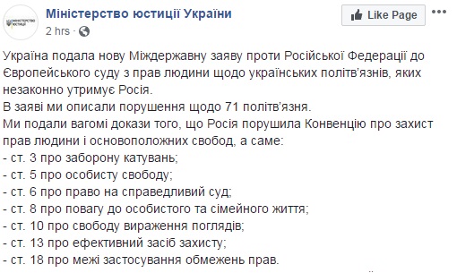 "Мы только что подали новую межгосударственную жалобу в Европейский суд по правам человека (ЕСПЧ, - Прим. Ред.) относительно украинских политзаключенных Кремля", - написал он, указав статьи, по которым был составлен иск: