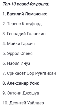 Кроме того, Александр Усик и Василий Ломаченко стали лучшими в своих дивизионах по версии World Boxing News (WBN). Также признание получил еще один украинский боксер - Артем Далакян. Он лидирует в легчайшем весе.