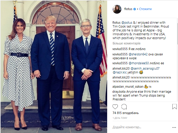 "Президент США и я были рады поужинать вместе с Тимом Куком в прошлый вечер в Бедминстере. Горжусь тем, что Кук делает в Apple - крупные инновации и вложения в США, которые положительным образом скажутся на нашей экономике", - написала в соцсети Мелания Трамп.