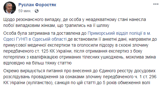 Нападавшему с кулаками на женщин в Одессе объявили подозрение по ст. 125 УК Украины. Его задержали и доставили в Приморский отдел полиции города. Об этом сообщил советник главы полиции области Руслан Форостяк в Facebook.