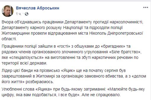 Также Аброськин сообщил, что лидер ОПГ по кличке Яцык был арестован в Житомире за организацию заказного убийства еще в начале августа. "Любимые слова Яцыка при любом задержании: "Рисуйте любую цифру, которая вам нравится, и все будет". Но не сработало", - написал он.