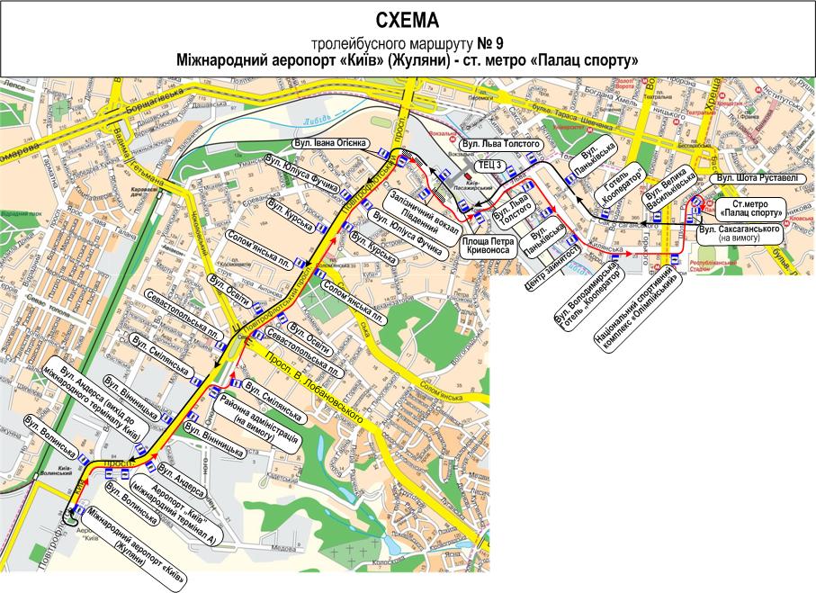 "Троллейбусы маршрута № 9 будут курсировать по схеме: Международный аэропорт "Киев" имени Игоря Сикорского - проспект Воздухофлотский - улица Смелянская - улица Народного Ополчения (в обратном направлении проспект Воздухофлотский) - Севастопольская площадь - проспект Воздухофлотский - улица Ивана Огиенко - улица Георгия Кирпы (в обратном направлении улица Ползунова) - улица Василия Липковского - улица Льва Толстого - улица Жилянская (в обратном направлении улица Саксаганского) - улица Шота Руставели - улица Рогнидинская - улица Эспланадная - станция метро "Дворец спорта", - уточнили в пресс-службе.